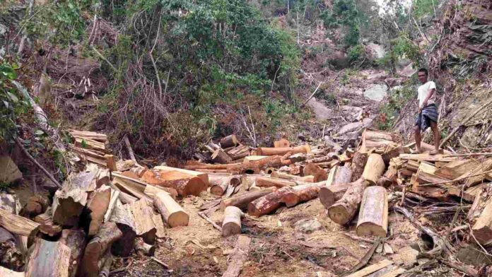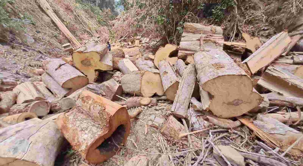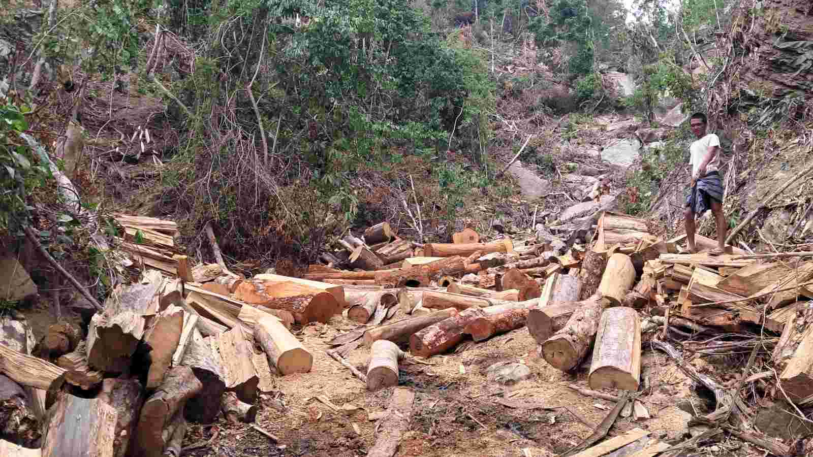 ঝিরির ওপর পাহাড় কেটে তৈরি করা সড়কের দুই পাশে স্তুপ করে রাখা হয়েছে বিভিন্ন আকারের গাছের গুঁড়ি। বহু গাছ অর্ধেক কেটে ফেলো রাখা হয়েছে। এসব গাছের দৈর্ঘ্য ৬০ থেকে ১০০ফুট এবং প্রস্থ ১০থেকে ১৫ফুট। অভিযোগ রয়েছে, জোত পারমিটের ‘কাগজ’ দেখিয়ে অধিকাংশ কাঠ পাচার করা হচ্ছে, আর কিছু কাঠ আলীকদমের অবৈধ ইটভাটায় জ্বালানি হিসেবে বিক্রি করা হচ্ছে।