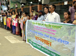 অবৈধ পাথর ও বালি উত্তোলনের প্রতিবাদে বান্দরবানে মানববন্ধন