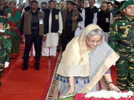 আওয়ামী লীগের প্রতিষ্ঠাবার্ষিকীতে বঙ্গবন্ধুর প্রতিকৃতিতে শেখ হাসিনার শ্রদ্ধাঞ্জলি